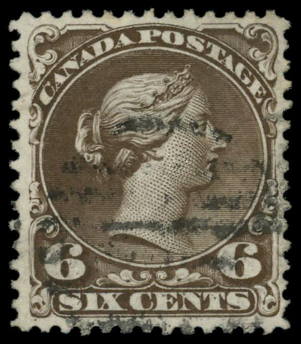 1868, Large Queen, 6¢ dark brown (Scott 27), Fine to Very Fine. Scott $140. (Image)