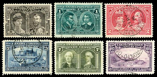 1908, Quebec Tercentenary, ½¢-10¢ (Scott 96-101), pristine with sharp detail and generally lightly cancelled; lovely group, Very Fine. Scott $309. (Image)