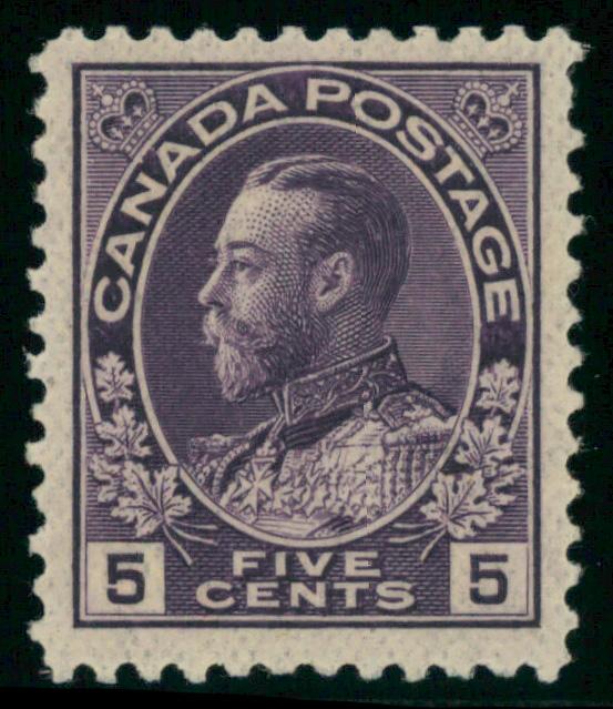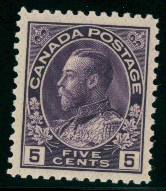 1925, King George V "Admiral", 5¢ violet, dry printing (Scott 112c), o.g., lightly hinged, Extremely Fine. Scott $53. (Image)