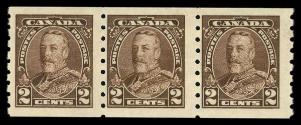 1935, 2c brown King George V coil, damaged '2' variety (Scott 229 var.), strip of 3, variety at center, o.g., lightly hinged, Fine to Very Fine. Unitrade 229ii. Scott $125. (Image)