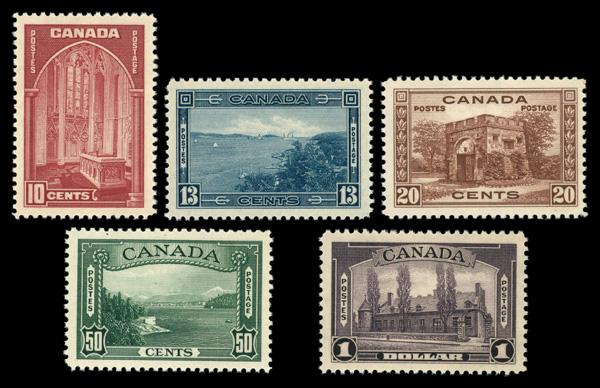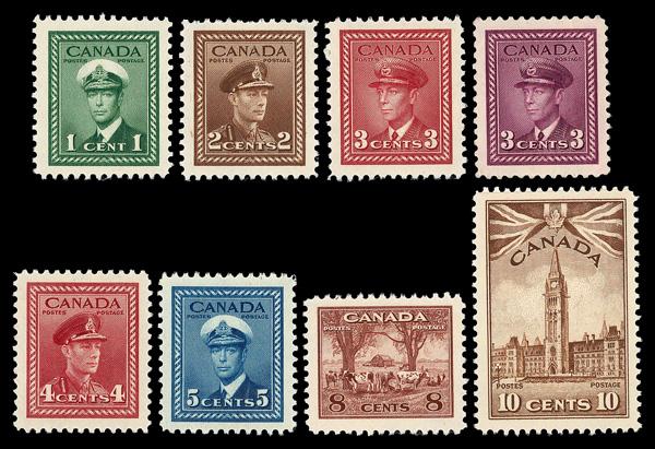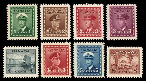 1942-43, King George VI "War" definitives, 1¢ to $1 complete (Scott 249-262), o.g., never hinged or lightly hinged, Extremely Fine. Scott $115. (Image)