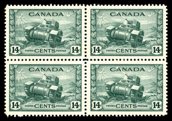 1942, 14¢ Tank (Scott 259), block of 4, o.g., never hinged, Extremely Fine. Scott $51. (Image)
