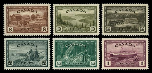 1946, King George VI "Peace" definitives, 8¢ to $1 complete (Scott 268-273), o.g., lightly hinged, Extremely Fine. Scott $89. (Image)