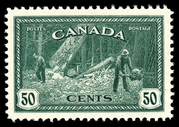 1946, 50¢ Lumbering (Scott 272), o.g., never hinged, Extremely Fine to Superb, with 2018 P.S.E. certificate graded XF-SUP 95. SMQ XF-SUP 95; $70. (Image)