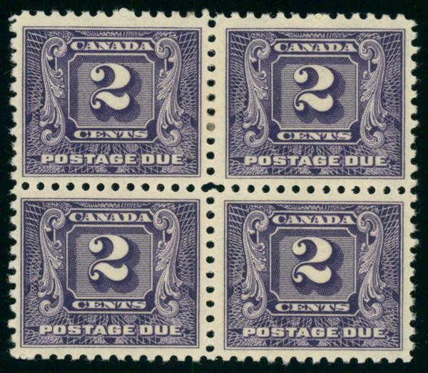 Postage Due, 1930, 2¢ dark violet (Scott J7), block of 4, o.g., hinge remnant (2 stamps never hinged), Very Fine to Extremely Fine. Scott $42. (Image)