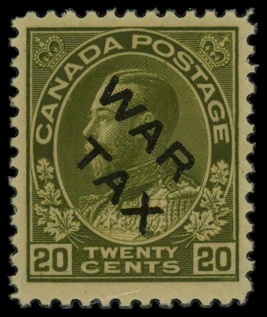 1915, 20c olive green Admiral over printed WAR TAX in red, single, o.g., never hinged, Fine to Very Fine. Unitrade MR2C; C$540 ($400). Van Dam FWT2; C$350 ($260). (Image)