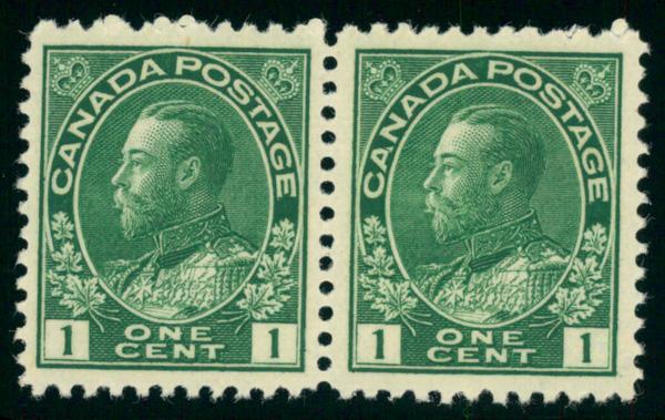 1912, King George V "Admiral", 1¢ dark green (Scott 104), pair, o.g., never hinged, Fine to Very Fine. Scott $130. (Image)