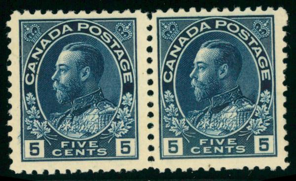 1912, King George V "Admiral", 5¢ dark blue (Scott 111), pair, o.g., very lightly hinged, Fine to Very Fine. Scott $420. (Image)