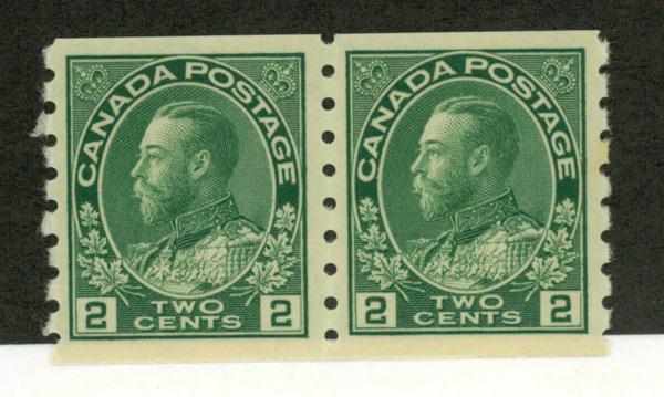 1922, King George V "Admiral" coil, 2¢ green, perf. 8 vertically (Scott 128), pair, o.g., never hinged, Fine to Very Fine. Scott $100. (Image)