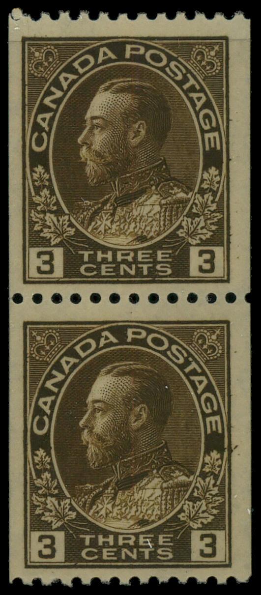 1921, King George V "Admiral", 3¢ brown coil (Scott 134), pair, o.g., never hinged, Fine to Very Fine. Scott $50. (Image)