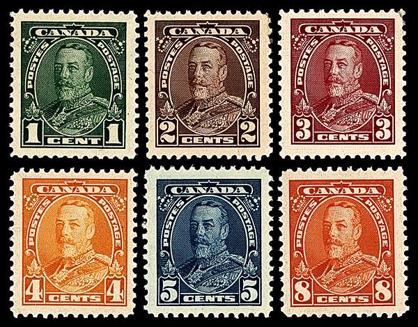 1932, King George V "Medallion" definitives, 1¢ to 13¢ complete (Scott 195-201), o.g., lightly hinged, Fine to Very Fine. Scott $142. (Image)