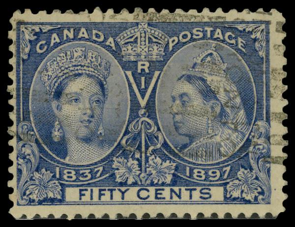 1897, Queen Victoria Jubilee, 50¢ ultramarine (Scott 60), single, o.g., hinged, Fine to Very Fine. Scott $190. (Image)