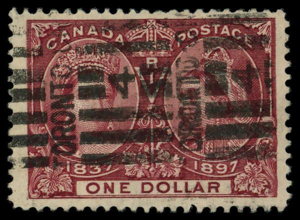 1897, Queen Victoria Jubilee, $1 lake (Scott 61), roller cancel; crease, Very Fine. Scott $750. (Image)