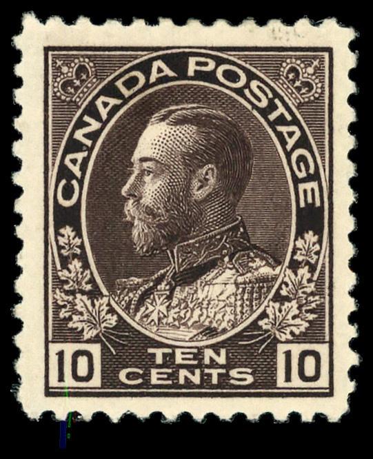 1912, King George V "Admiral", 10¢ plum (Scott 116), o.g., hinge remnant, Fine to Very Fine. Scott $275. (Image)