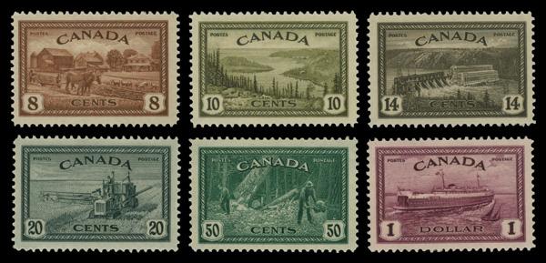 1946, King George VI "Peace" definitives, 8¢ to $1 complete (Scott 268-273), complete set of singles, o.g., never hinged, Fine to Very Fine. Scott $73. (Image)