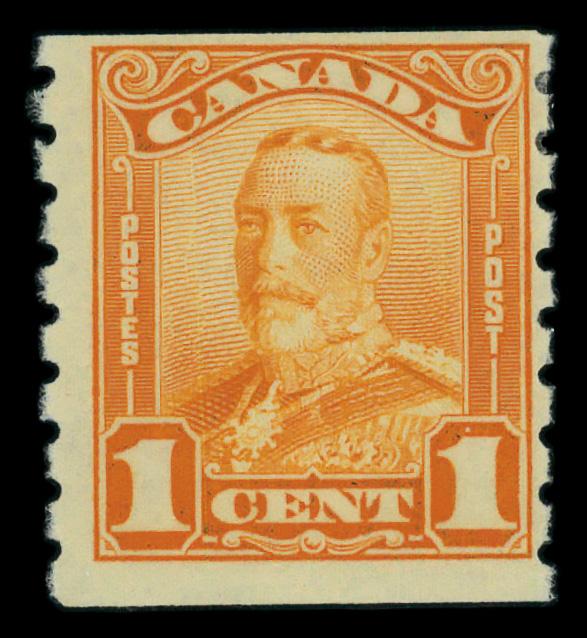 1929, King George V, 1¢ orange coil (Scott 160), o.g., small hinge remnant, Fine. Scott $40. (Image)