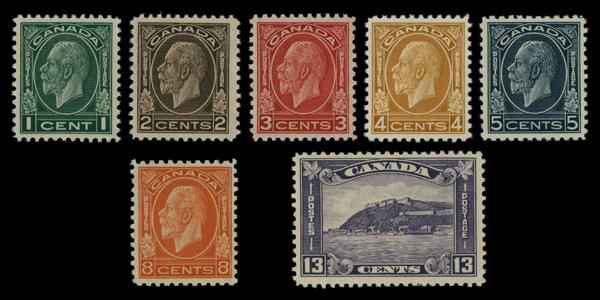 1932, King George V "Medallion" definitives, 1¢ to 13¢ complete (Scott 195-201), complete set of singles, o.g., never hinged, Fine to Very Fine. Scott $264. (Image)