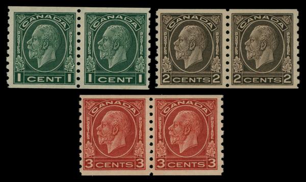 1933, King George V "Medallion" coils, 1¢ to 3¢ complete (Scott 205-207), complete set of pairs, o.g., never hinged, Fine to Very Fine. Scott $175. (Image)