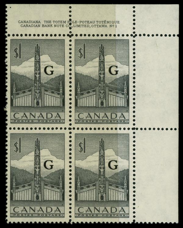 Official, 1953, $1 Totem Pole, "G" overprint (Scott O32), plate block of 4, o.g., never hinged, Fine to Very Fine. Scott $50. (Image)