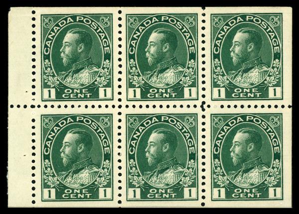 1912, King George V "Admiral", 1¢ blue green, booklet pane of 6 (Scott 104a), P.O. fresh with exceptional centering, o.g., never hinged, Extremely Fine. Unitrade 104a; C$80 ($60). Scott $60. (Image)
