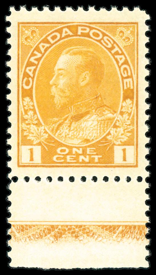 1922, King George V "Admiral", 1¢ yellow, wet printing, type I (Scott 105), bottom margin single with type C lathework, wonderfully well-centered with bright color, unblemished o.g., never hinged, Very Fine and choice. Unitrade 105; C$180 ($130). (Image)