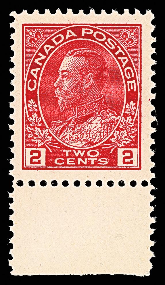 1912, King George V "Admiral", 2¢ deep rose red (Scott 106e), bottom margin single, o.g., never hinged, a stellar example with bright color, sharp detail, and massive, balanced margins, Extremely Fine, with 2022 Greene Foundation certificate. Unitrade 106ii; C$150 ($110). Scott $100. (Image)