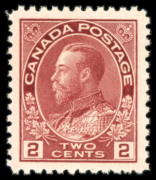 1912, King George V "Admiral", 2¢ rose carmine (Scott 106c), mathematically precise centering within large balanced margins, fresh color, o.g., never hinged, Extremely Fine and choice, a real gem. Unitrade 106c; C$120 ($90). Scott $75. (Image)