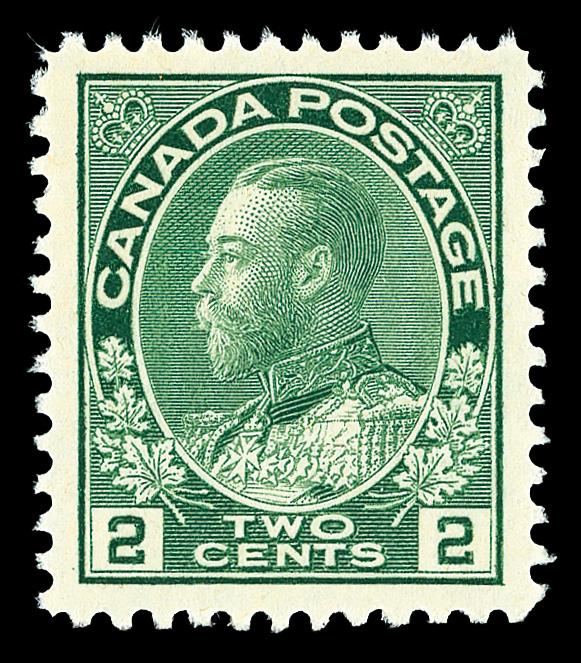 1922, King George V "Admiral", 2¢ deep green, wet printing (Unitrade 107i), marvelously well-centered amidst large balanced margins, rich characteristic color, o.g., never hinged, Extremely Fine, a real gem for the perfectionist. Scott 107 var. Unitrade C$150 ($110). (Image)