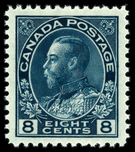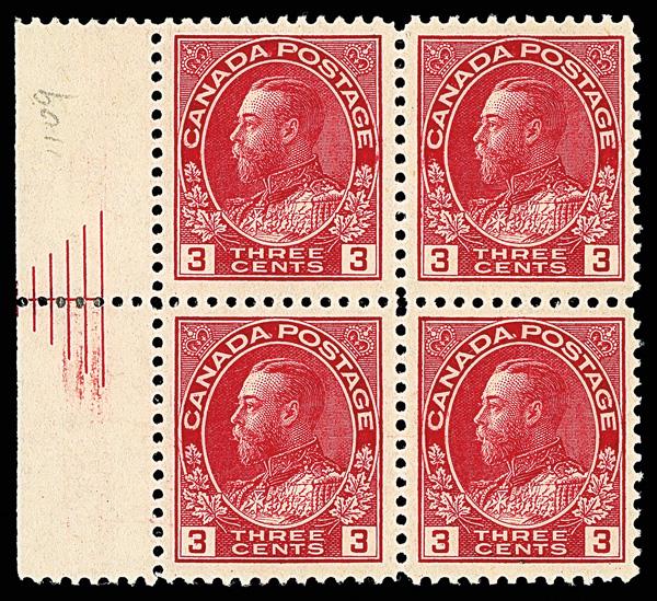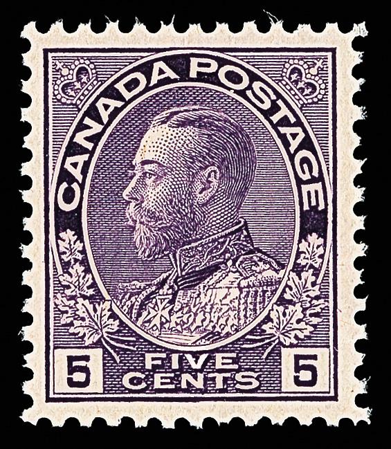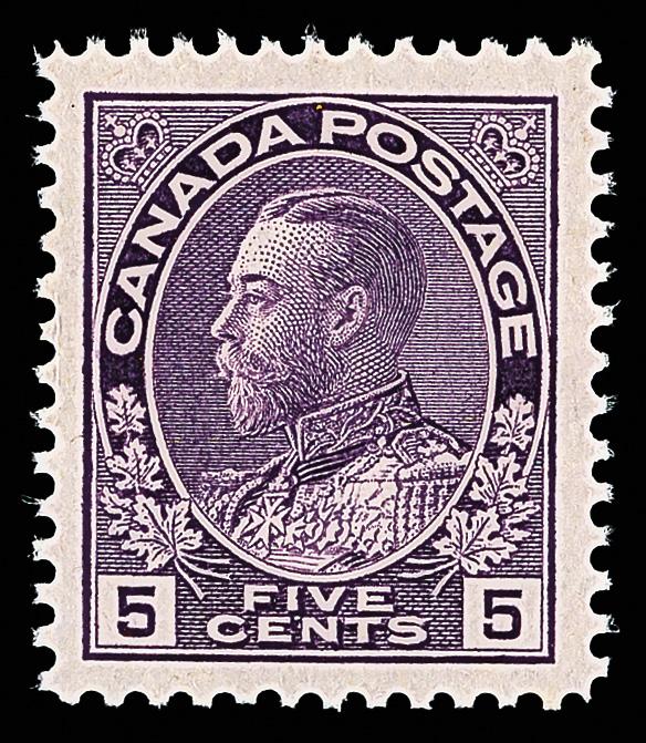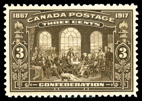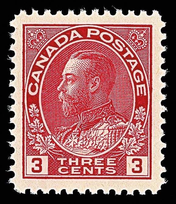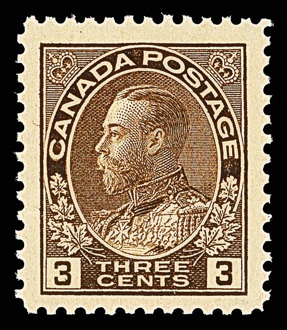 1917, 3¢ Confederation (Scott 135), unusually well-centered, bold color, unblemished o.g., never hinged, Very Fine and attractive. Unitrade 135; C$210 ($160). Scott $150. (Image)