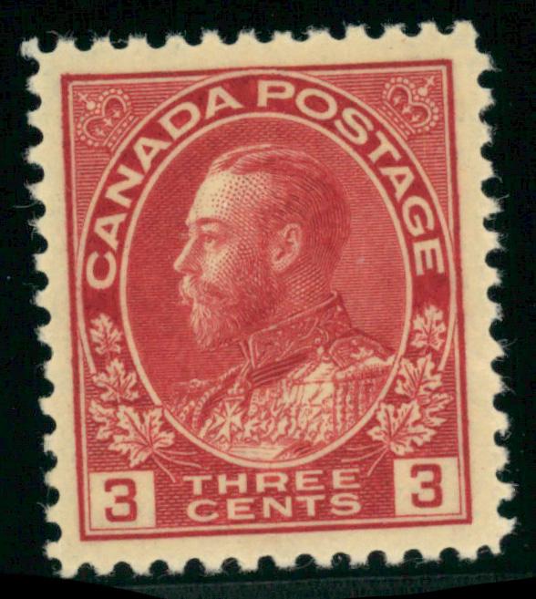 1924, King George V "Admiral", 3¢ carmine, type II (Scott 109c), o.g., never hinged, fresh and sound with immense color depth, very well centered on luminous paper, Very Fine to Extremely Fine. Unitrade C$210 ($160). Scott $150. (Image)
