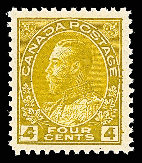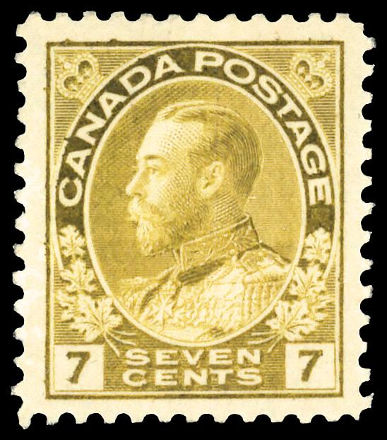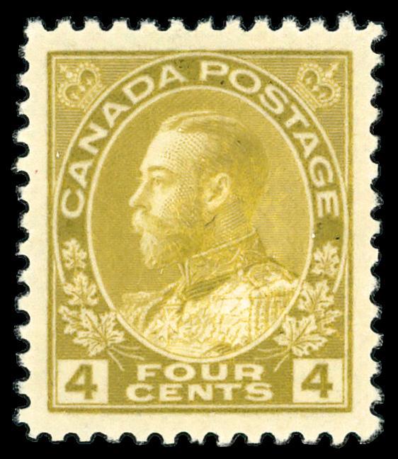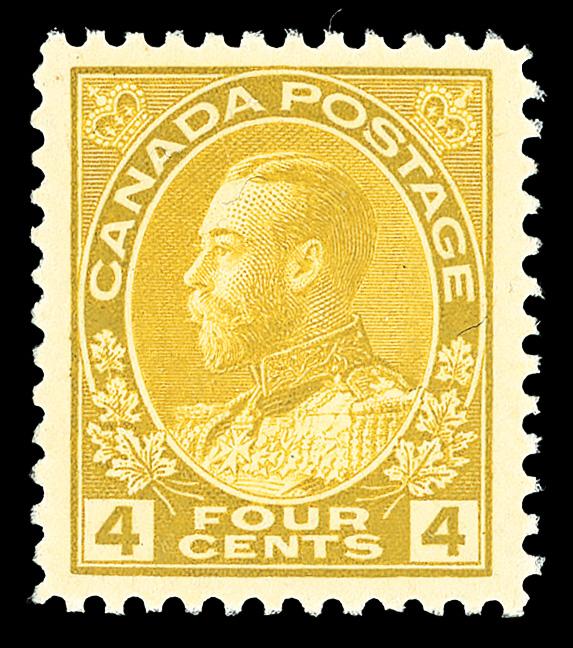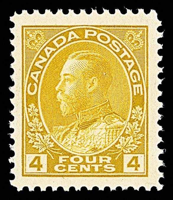 1918, King George V "Admiral", 3¢ yellow brown, wet printing (Scott 108b), o.g., never hinged, Post Office fresh with solid color and large margins, Very Fine. Unitrade C$195 ($140). Scott $105. (Image)