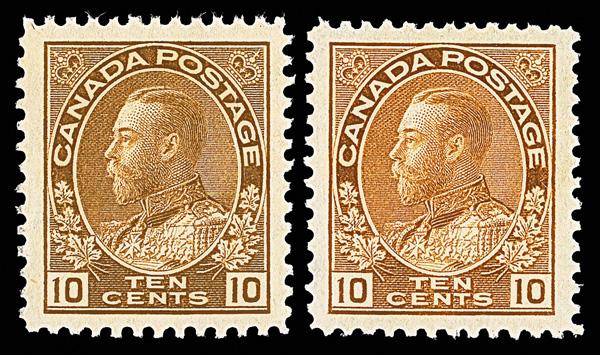1925, King George V "Admiral", 10¢ bister brown & 10¢ yellow brown (Scott 118, 118b), o.g., never hinged, each fresh and sound with exceptional centering; a lovely side-by-side shade comparison, Very Fine. Unitrade C$420 ($310). Scott $250. (Image)