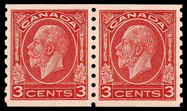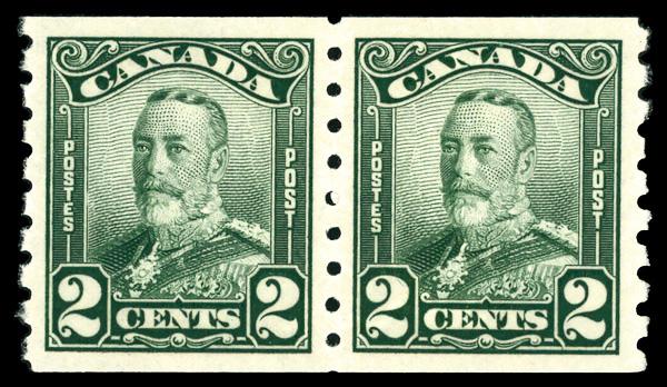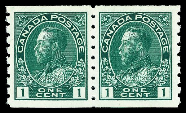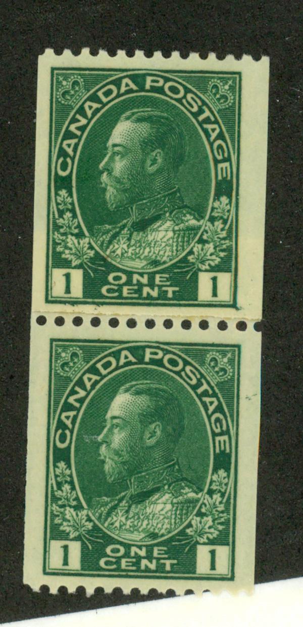 1915, King George V "Admiral", 1¢ dark green coil (Scott 131), paste-up pair, o.g., never hinged, Fine to Very Fine. Unitrade 131iii; C$98 ($70). Scott $35. (Image)