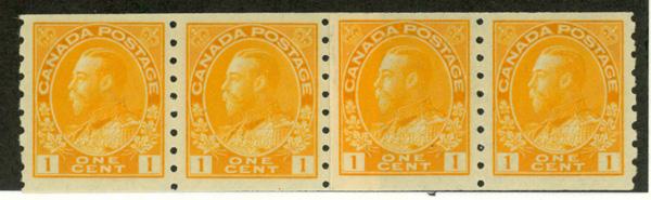 1923, King George V "Admiral" coil, 1¢ yellow, Die II, dry printing, perf. 8 vertically (Scott 126), stripe of 4 with a paste-up pair, o.g., never hinged. Unitrade 126i. Scott $102. (Image)