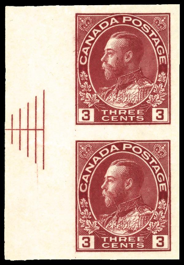 1924, King George V "Admiral", 3¢ carmine, imperf. (Scott 138), left margin vertical pir showing the "pyramid guide", wide well-balanced margins, rich color, o.g., some light natural gum wrinkles mostly in the margin, Very Fine. Unitrade 138i. (Image)