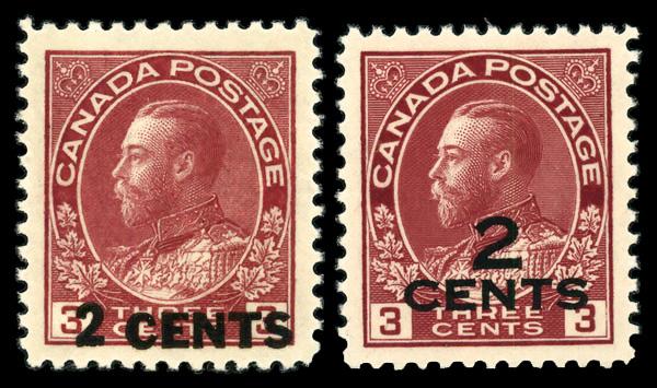 1926, King George V "Admiral", 2¢ on 3¢ carmine (Scott 139-40), set of 2, each P.O. fresh with excellent centering and bold color, unblemished o.g., never hinged, Extremely Fine and choice. Unitrade 139-40; C$300 ($220). Scott $202. (Image)
