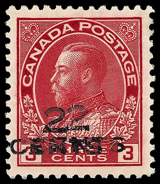 1926, King George V "Admiral", 2¢ on 3¢ carmine, double surcharge (Scott 140a), exceptionally well-centered within balanced "boardwalk" margins, o.g., light corner crease, Extremely Fine appearance; ex-Sir Gawaine Baillie collection, clear 1973 P.F. cert. Unitrade 140a; C$350 ($260). Scott $250. (Image)