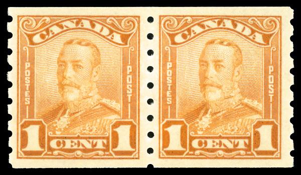 1929, King George V "Scroll", 1¢ orange, horizontal coil, perf. 8 vertically (Scott 160), well centered pair with radiant color and full perfs, o.g., never hinged, Very Fine. Unitrade 160; C$240 ($180). Scott $160. (Image)