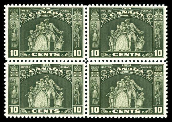 1934, 10¢ United Empire Loyalists (Scott 209), impressive block of four with precise centering, P.O. fresh, o.g., never hinged, choice Very Fine. Unitrade 209; C$320 ($240). Scott $232. (Image)