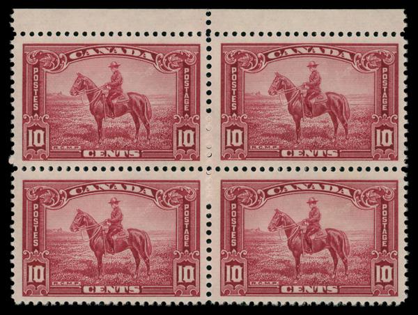 1935, 10¢ Mounted Police (Scott 223), block of 4, o.g., never hinged, Very Fine to Extremely Fine. Scott $52. (Image)