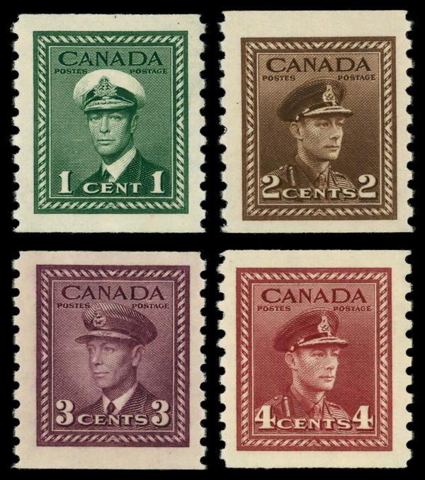 1948, King George VI coils, 1¢ to 4¢ complete (Scott 278-281), o.g., lightly hinged, Very Fine to Extremely Fine. Scott $64. (Image)
