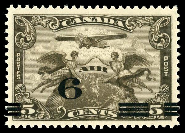 Airmail, 1932, 6¢ on 5¢ brown olive, surcharge shifted (Unitrade C3ii), exceptionally well centered single with the surcharge shifted dramatically to the left with portion of the left bars appearing at the right, o.g., never hinged, Very Fine and choice. Scott C3 var. Unitrade C$250 ($190). (Image)