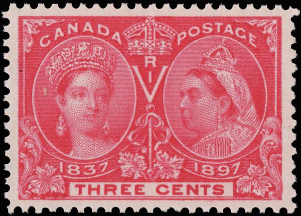 1897, Queen Victoria Jubilee, 3¢ bright rose (Scott 53), a choice mint single, o.g., never hinged, exquisite color and centering, Extremely Fine, with a 2019 P.S.E. certificate graded XF 90. SMQ XF 90; $100. Scott $75. (Image)