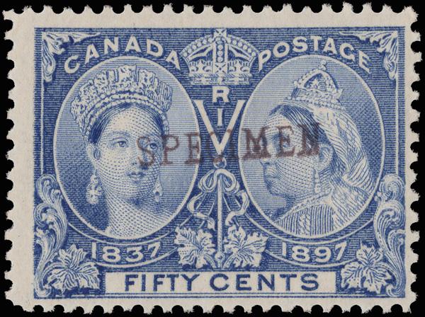 1897, Queen Victoria Jubilee, 50¢ ultramarine, overprinted "Specimen" (Scott 60S), o.g., never hinged, exceptionally fresh and bright, Fine, with a 2020 P.S.E. certificate. Unitrade C$600 for Fine ($450). (Image)