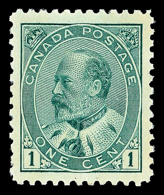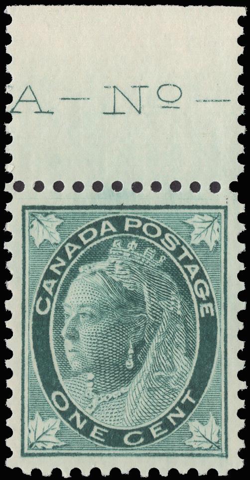 1897, Queen Victoria "Maple Leaf", 1¢ blue green (Scott 67), a choice top sheet margin single with partial imprint, o.g., never hinged, bright, fresh and beautifully centered, Very Fine to Extremely Fine, with 2020 P.S.E. certificate graded VF-XF 85. SMQ VF-XF 85; $120. Scott $140. (Image)