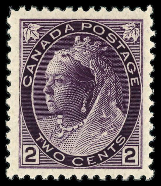 1898, Queen Victoria "Numeral", 2¢ purple (Scott 76), well centered within "larger than usual" margins, deep shade, Extremely Fine, o.g., never hinged. Unitrade 76; C$240 ($180). Scott $150. (Image)