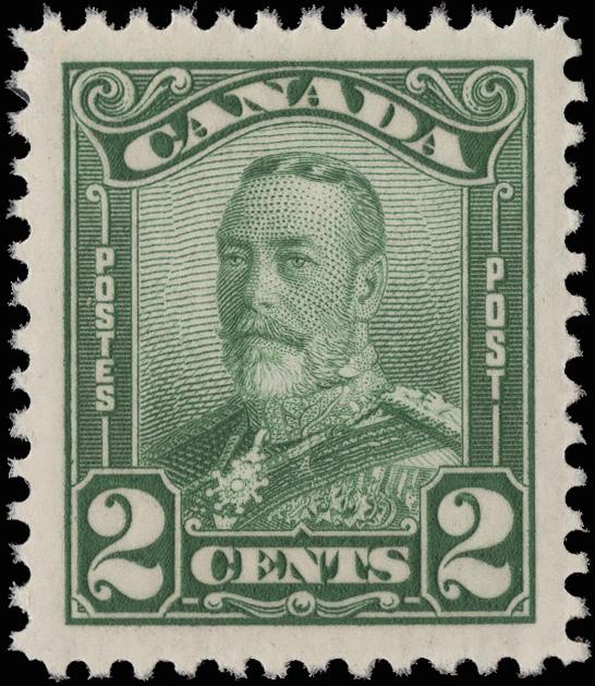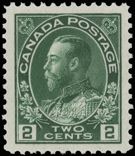 1922, King George V "Admiral", 2¢ yellow green, wet printing (Scott 107), a fabulous, perfectly centered mint single, o.g., never hinged, incredibly fresh and bright, Superb. SMQ does not price any grade higher than XF-Sup 95, with a 2019 P.S.E. certificate graded SUP 98. Unitrade C$150 ($110). Scott $90. (Image)