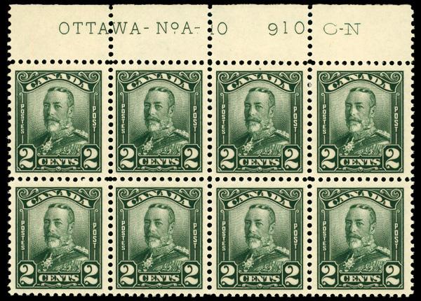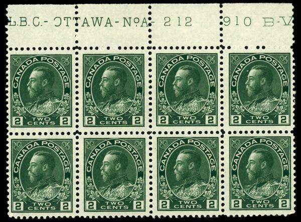 1918, King George V "Admiral", 3¢ brown, dry printing (Scott 108c), top Plate No.-A 119 block of 8, o.g. (stamps never hinged), bright and fresh, Fine to Very Fine. Scott $640 as singles. (Image)