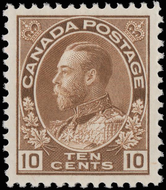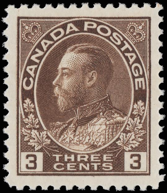 1918, King George V "Admiral", 3¢ brown, wet printing (Scott 108), a magnificent mint single, o.g., never hinged, post office fresh and absolutely perfectly centered, Superb, with a 2020 P.S.E. certificate graded SUP 98. Unitrade C$150 ($110). SMQ $140 for an XF-Sup 95. Scott $65. (Image)
