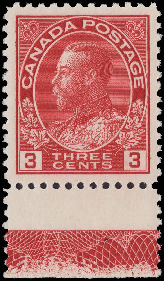 1923, King George V "Admiral", 3¢ carmine, type I (Scott 109), a choice bottom sheet margin single with 80% type D lathework, o.g., never hinged, fresh, bright and perfectly centered, Extremely Fine to Superb, with a 2019 P.S.E. certificate graded XF-SUP 95. SMQ XF-SUP 95; $105+. 180 for 100%. Scott $48+. (Image)